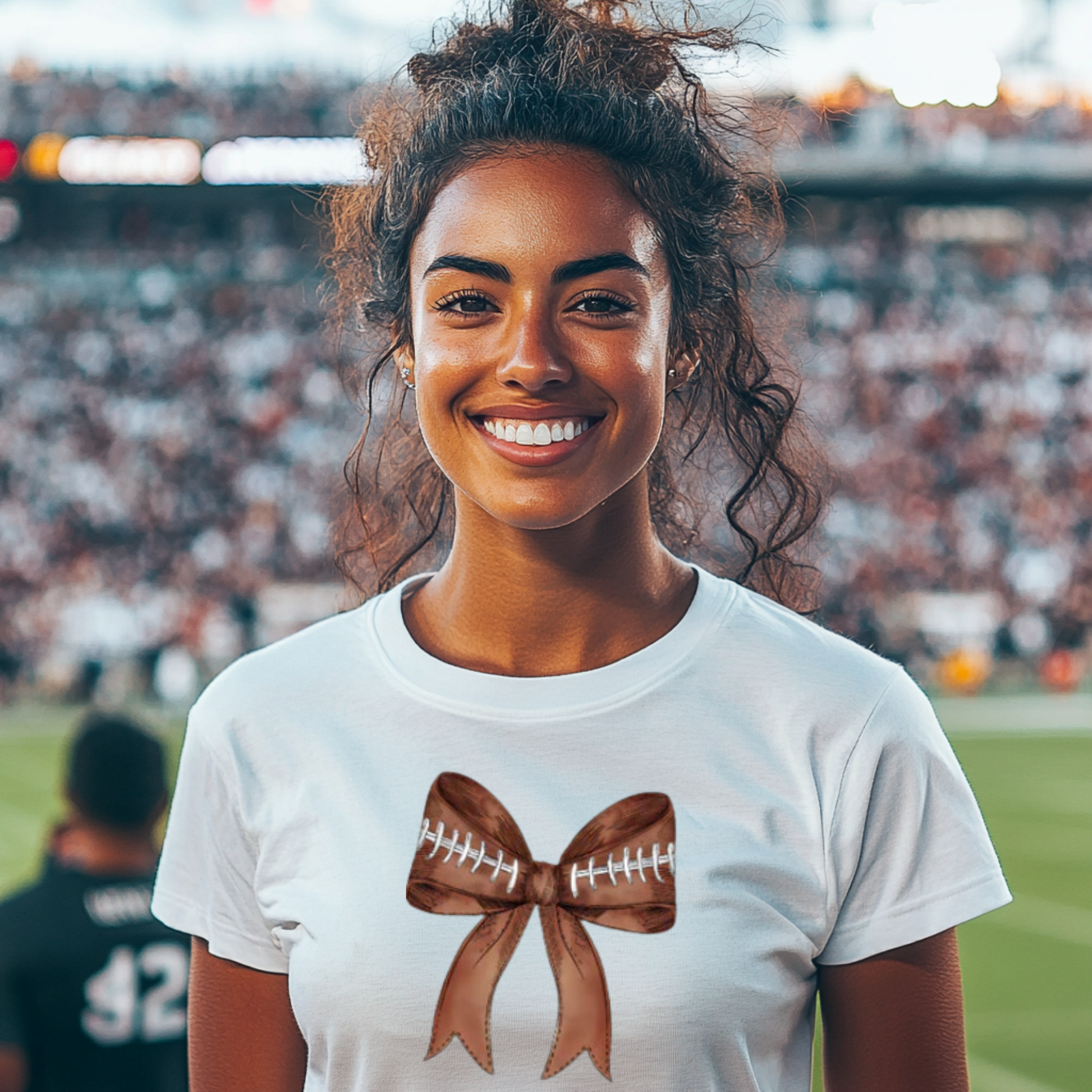 Score a winning look with our R02 FOOTBALL BOW SHIRT! Perfect for game day or everyday wear, this shirt features a unique football bow design that adds a touch of charm to any outfit. Show off your love for the game in style and stand out from the crowd!