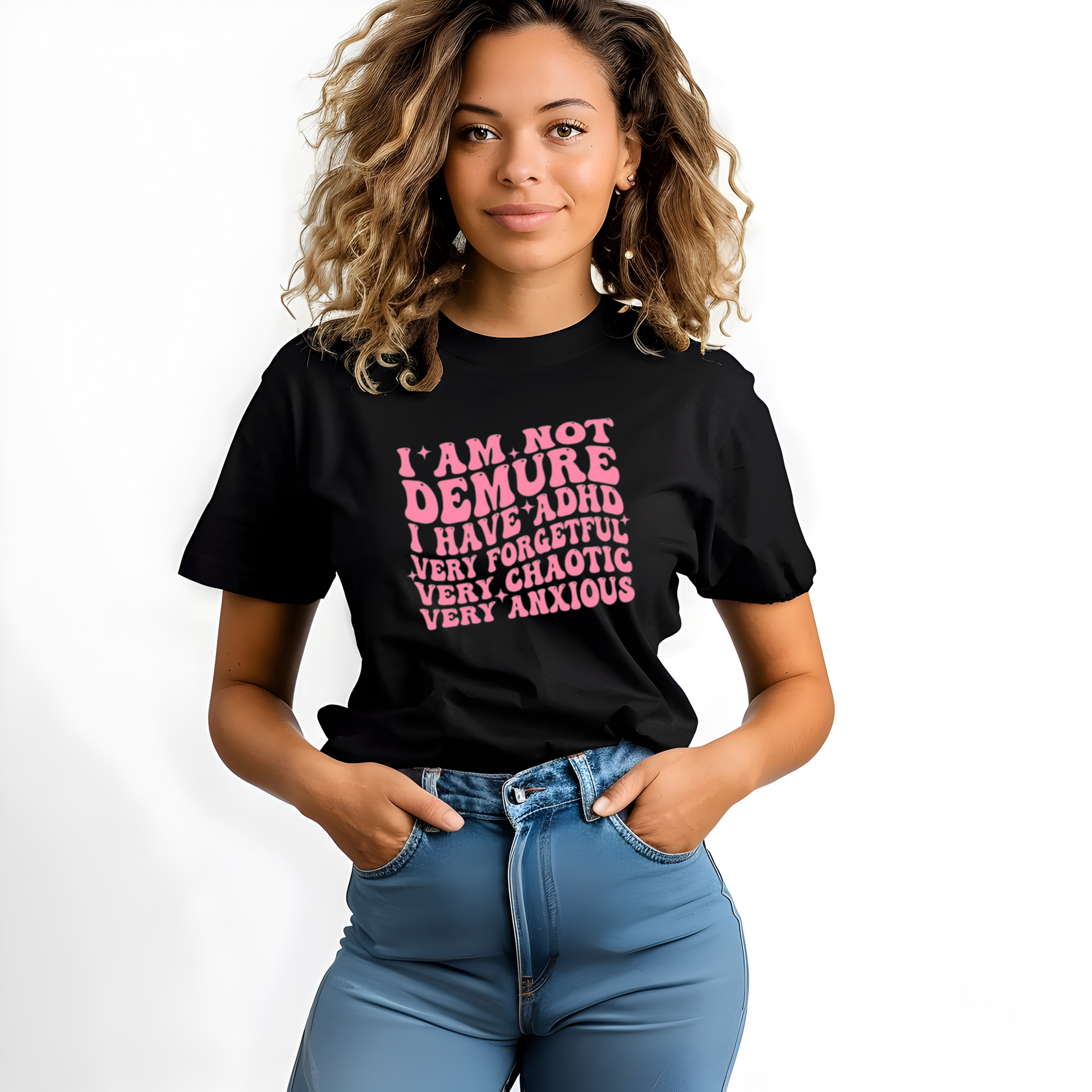 Unapologetically bold and confident, our "I AM NOT DEMURE" product will empower you to embrace your true self. Bye bye to playing small and hello to living out loud! Make a statement and stand out from the crowd with this product that celebrates individuality and authenticity.